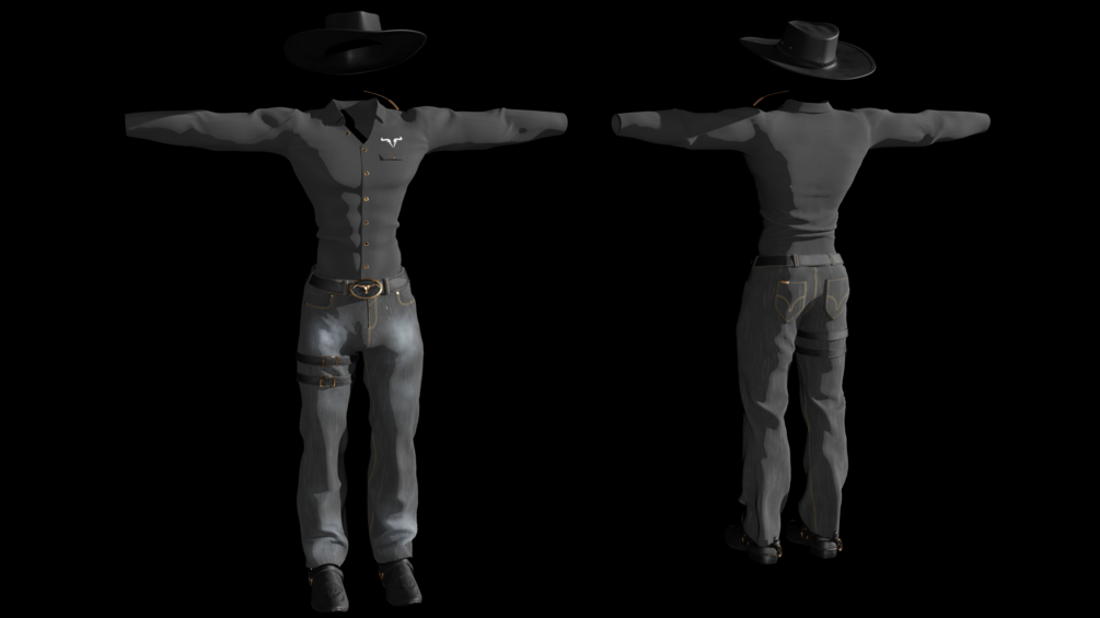 A Cowboy Outfit I made from scratch using Blender and textured in Substance Painter, it comes with Normals, Roughness, Metallic, Height, and 4+ base colored textures. Rigged. FBX included within the .rar.